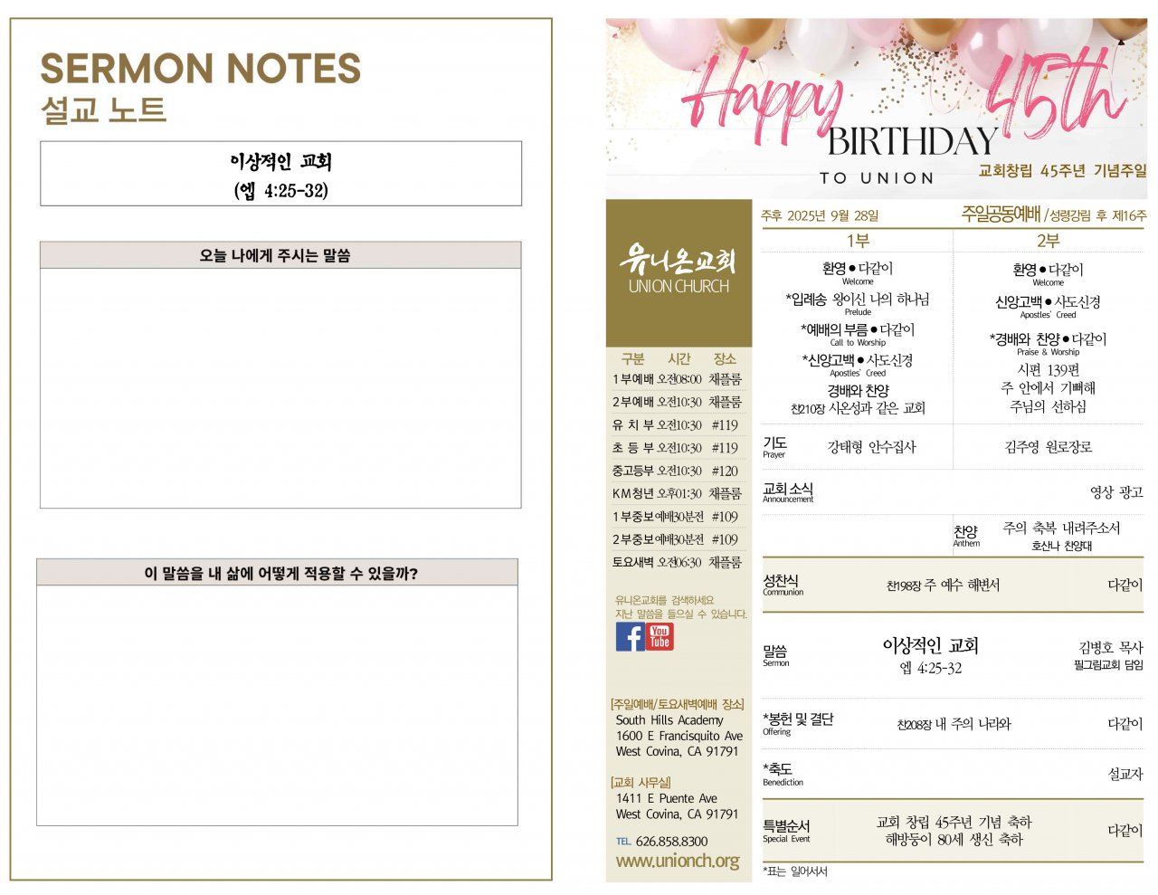 오늘은 교회 창립 45주년 기념 주일입니다. 지나온 시간 동안 유니온 교회를 인도해주신 주님의 은혜에 감사드리며