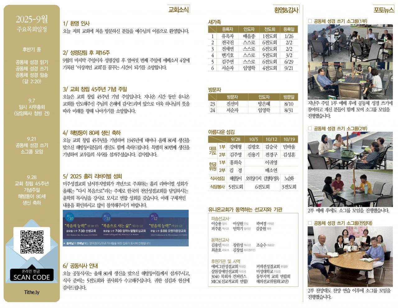 오늘 교회 창립 45주년을 기념하며 1945년에 태어나 올해 80세 생신을 맞으신 해방둥이분들의 생신도 함께 축하드립니다.