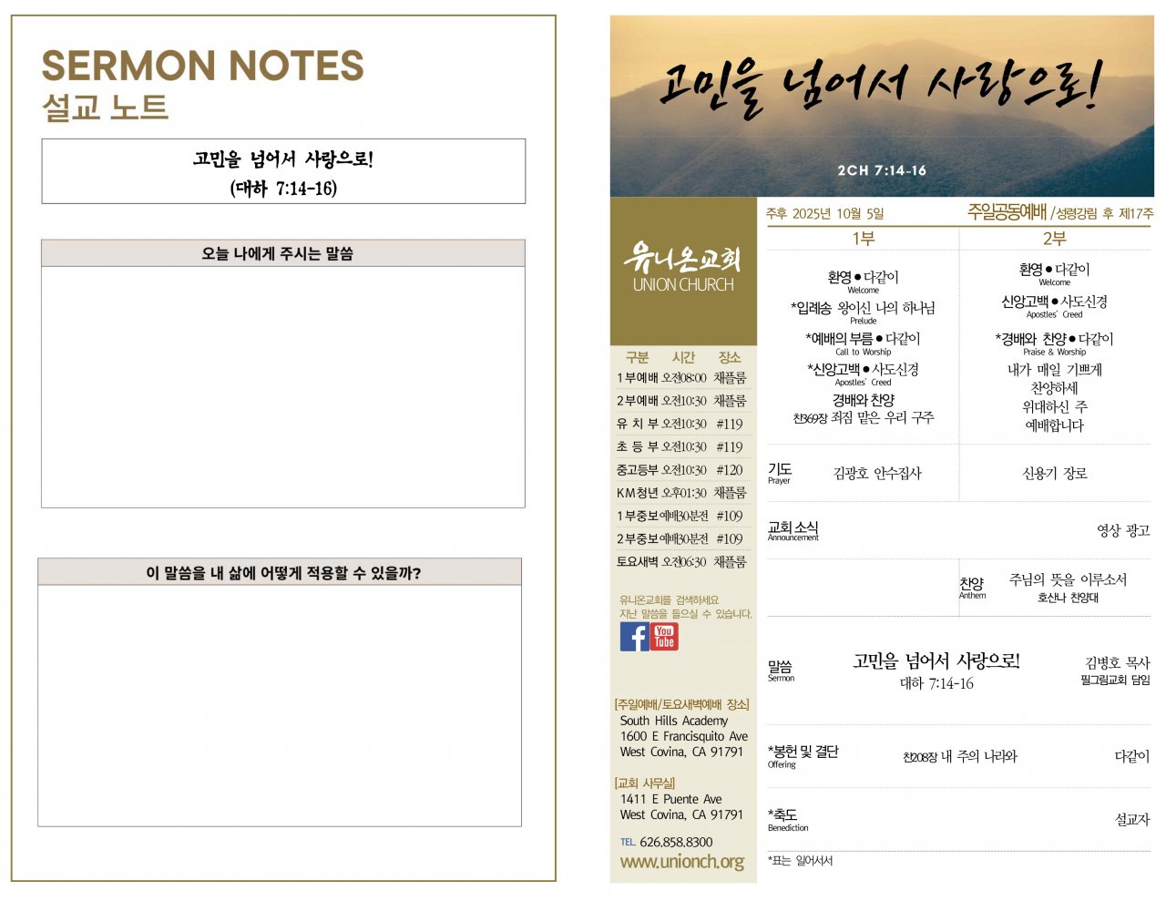 10월의 첫 주일이자 성령강림 후 열일곱 번째 주일에 고민을 넘어서 사랑으로 나아가는 시간이 되기를 소망합니다.