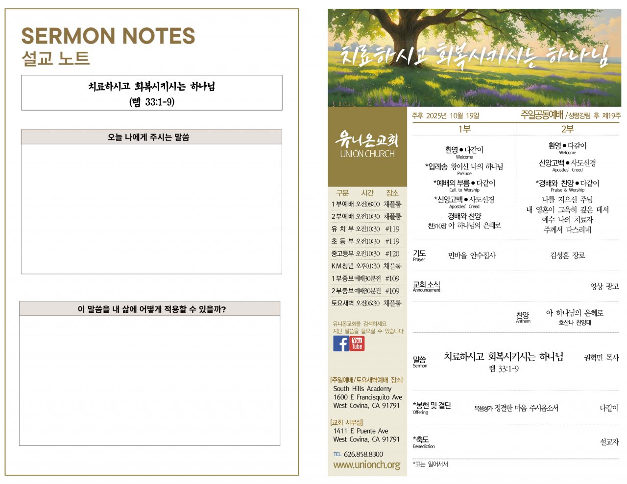 10월 셋째 주일이자 성령강림 후 열아홉 번째 주일에 치료하시고 회복시키시는 하나님의 은혜를 경험하는 유니온교회가 되기를 소망합니다.