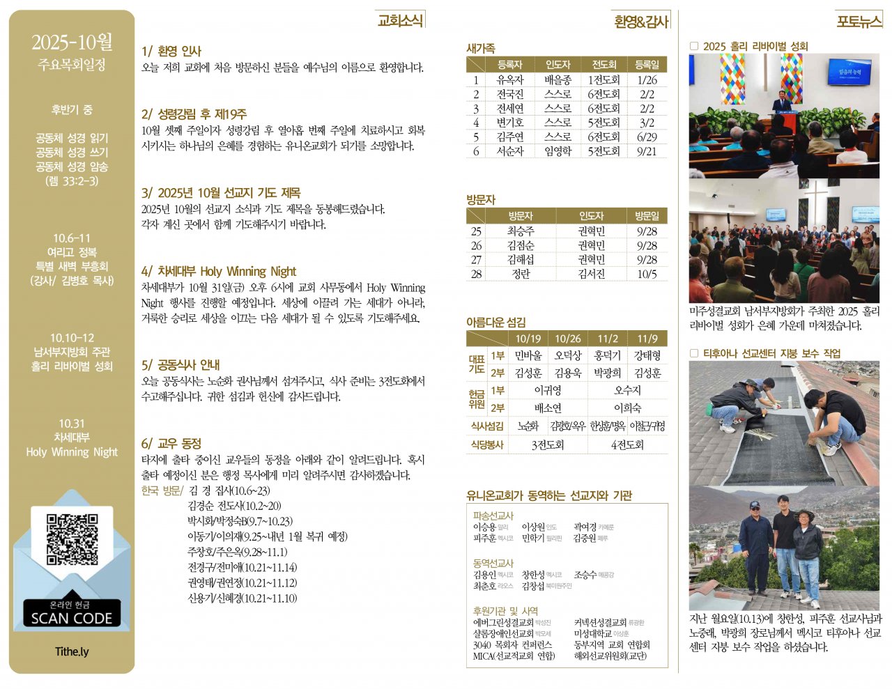 2025년 10월의 선교지 소식과 기도 제목을 동봉해드렸습니다. 각자 계신 곳에서 함께 기도해주시기 바랍니다.