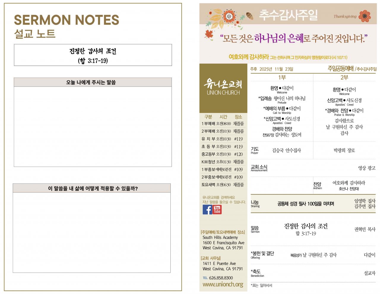 오늘은 추수감사주일입니다. 한 해의 감사를 올려드리는 귀한 시간이 되길 소망합니다.