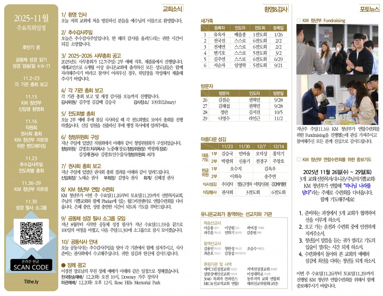 오늘 공동식사는 추수감사주일을 맞아 각 기관에서 함께 섬겨주시고, 식사 준비는 권사회에서 수고해주십니다. 귀한 섬김과 헌신에 감사드립니다.