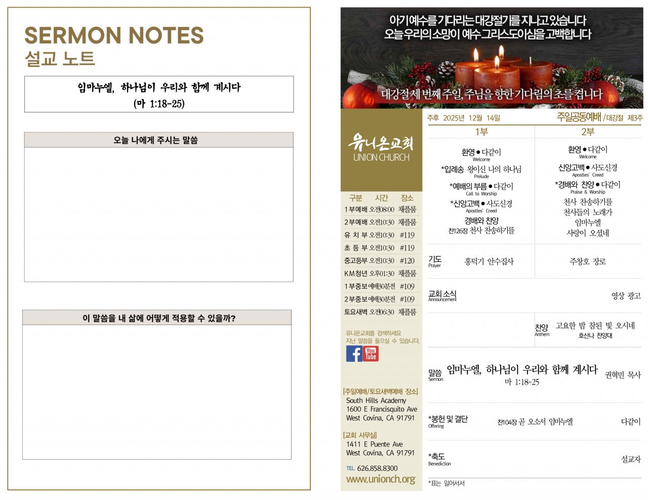 다음 주일(12.21)은 성탄주일을 맞아 2부 예배(오전 10시 30분)는 차세대부와 함께 채플룸에 모여 연합예배를 드립니다.