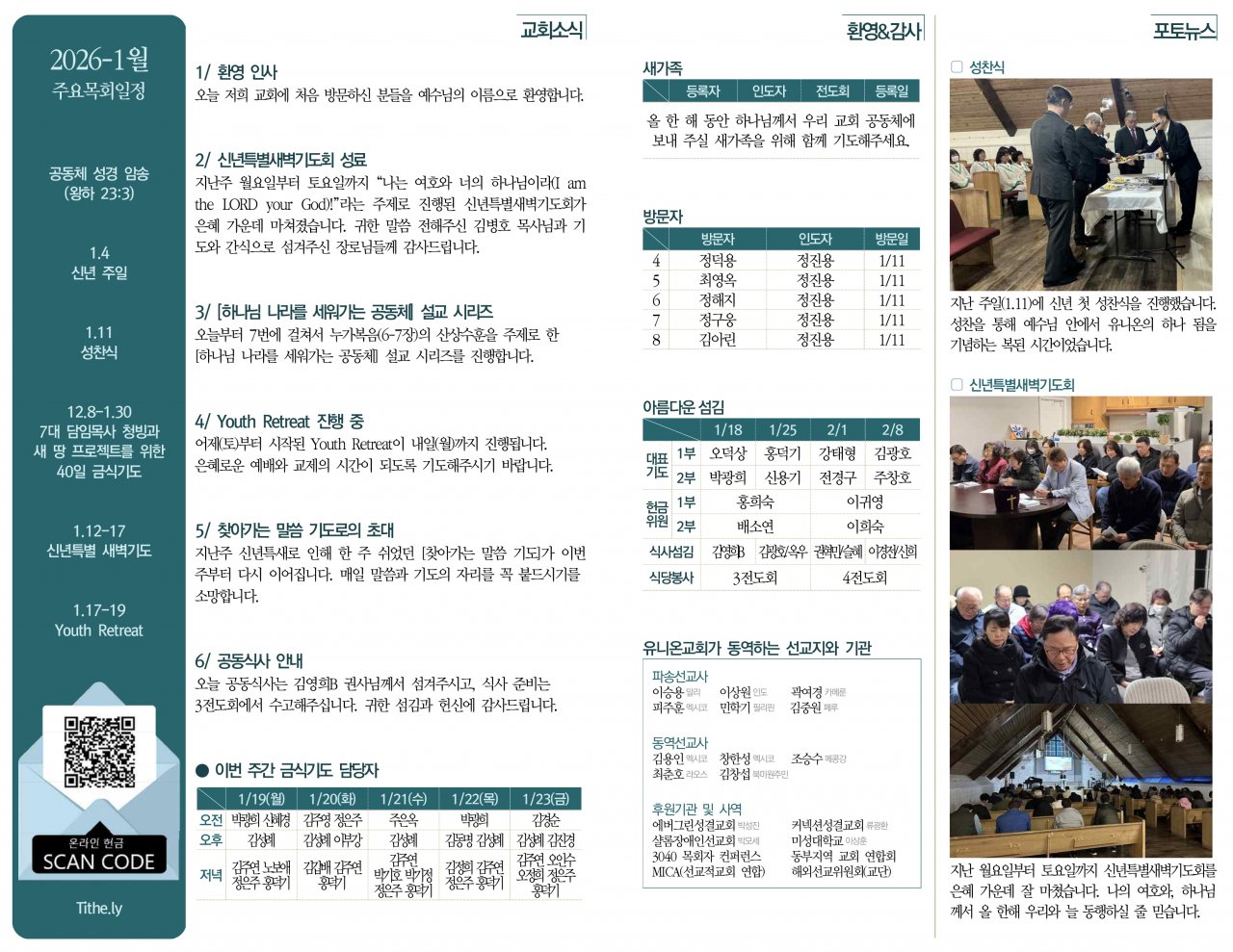 지난주 월요일부터 토요일까지 “나는 여호와 너의 하나님이라(I am the LORD your God)!”라는 주제로 진행된 신년특별새벽기도회가 은혜 가운데 마쳐졌습니다.