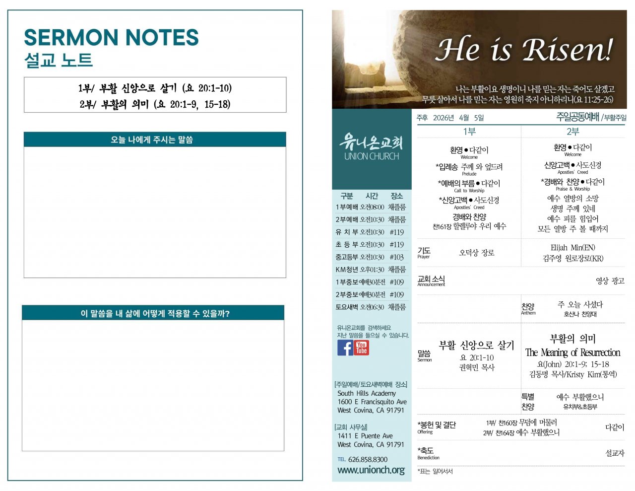 2부 연합예배 후에는 공동식사를 하시고 카페테리아 외부 마당에서 진행하는 Easter Market과 Egg hunting에도 참여해주시기 바랍니다.